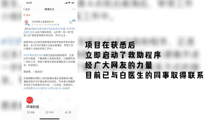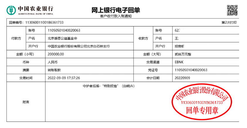 2022年9月9日,北京感恩公益基金会“守护者后盾行动”项目拨付20万元“特别抚恤”款项,受助方是支援威海疫情一线的山东省立医院临床医学检验专家白晓卉医生的家属。
