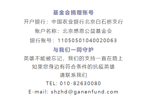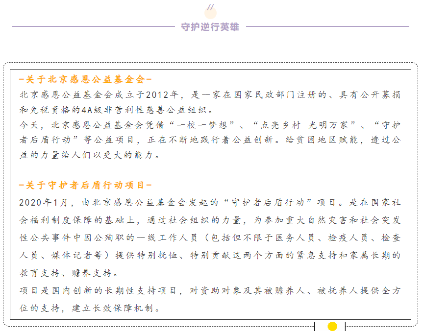 因为责任、使命还有非凡的勇气,她们冲在最前,冲在一线,没有丝毫犹豫。这种责任、使命的担当者还需要千万个你我去共同守护。我们不愿再看到“逆行者”在一线“不幸殉职”的报道,更多的期望是疫情早日结束,所有的一切都步入正轨。“守护者后盾行动”守护着“逆行者”的家属,让记忆与爱同行,让希望和阳光照进未来。