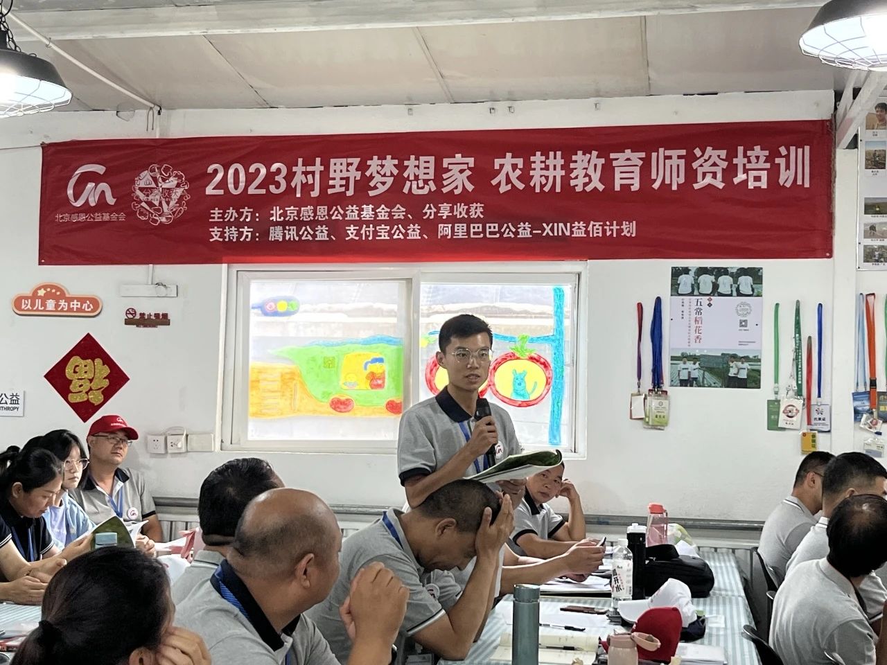 开营仪式上,北京感恩公益基金会的理事长周健老师为“村野梦想家”们讲解了为什么我们来到“分享收获”一个有机农场为乡村教师们做农耕教育培训。